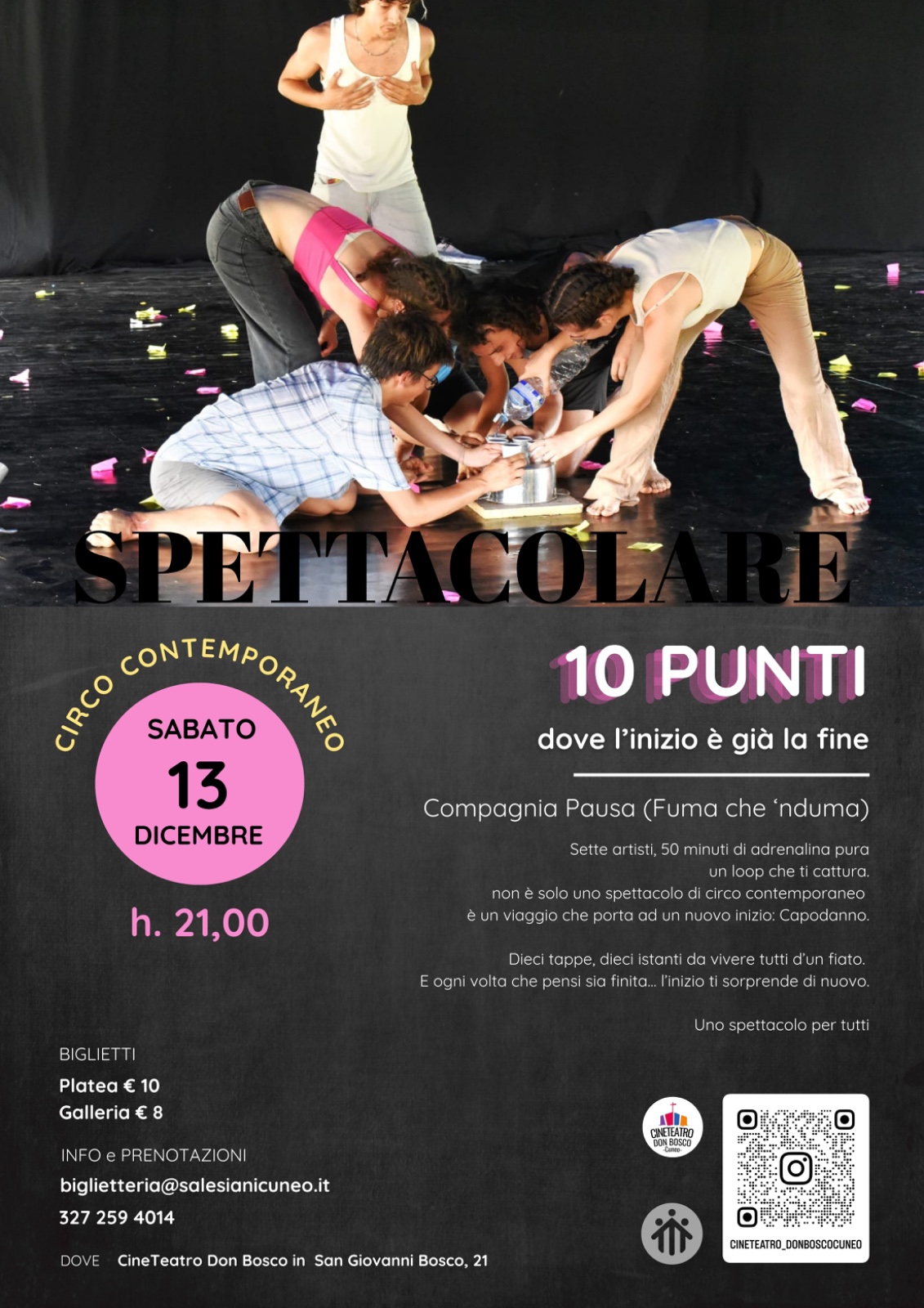 Sette artisti, 50 minuti di adrenalina pura, un loop che ti cattura. “10 Punti” non è solo uno spettacolo di circo contemporaneo è un viaggio che porta ad un nuovo inizio: Capodanno. Dieci tappe, dieci istanti da vivere tutti d’un fiato. E ogni volta che pensi sia finita… l’inizio ti sorprende di nuovo. Siamo la compagnia “Pausa”, cresciuti nelle scuole di circo Fuma Che ’nduma, e abbiamo creato questo spettacolo interamente in autoregia. Dopo circa 9 mesi di lavoro, tra sfide e momenti complicati… ce l’abbiamo fatta!