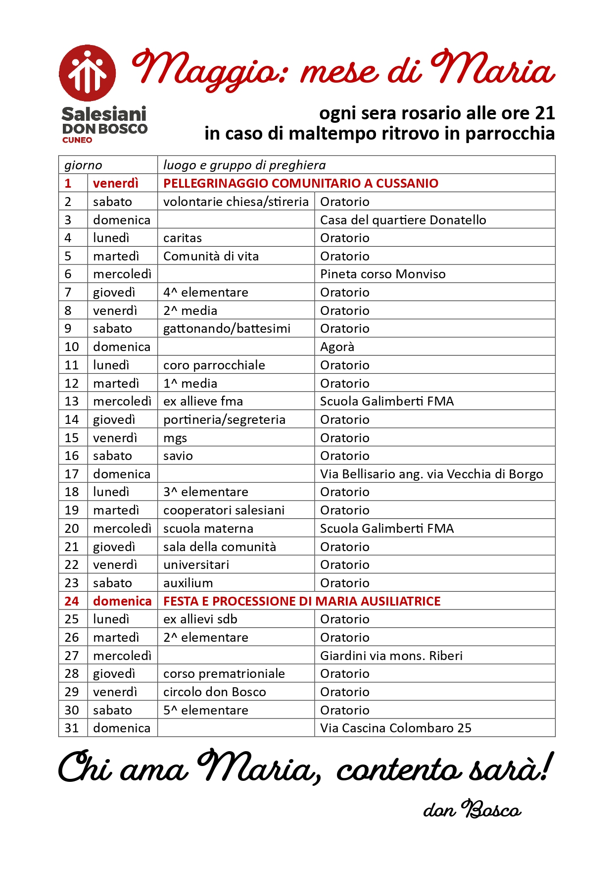 Dal 15 maggio avrà inizio la grande novena alla festa di Maria Ausiliatrice. Il mattino di quel venerdì parteciperemo alla Santa Messa delle 7.00 al santuario cittadino della Madonna della Riva, preceduta dal Rosario delle 6.30 e ogni sera proseguiremo il Rosario delle 21.00 con l’aggiunta delle Litanie Lauretane.